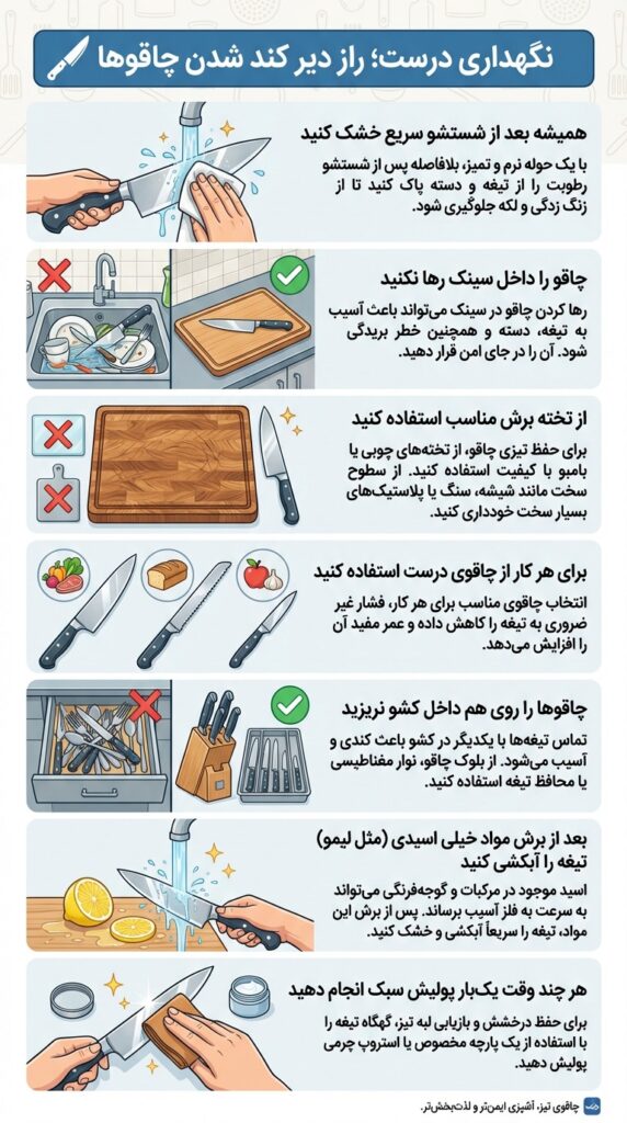 تیزکردن چاقو مهم است، اما هوشمندانهترش این است که کاری کنیم چاقوها کمتر کند شوند. بسیاری از کند شدنها اصلاً به کیفیت چاقو مربوط نیست؛ به عادتهای اشتباه استفاده و نگهداری برمیگردد.