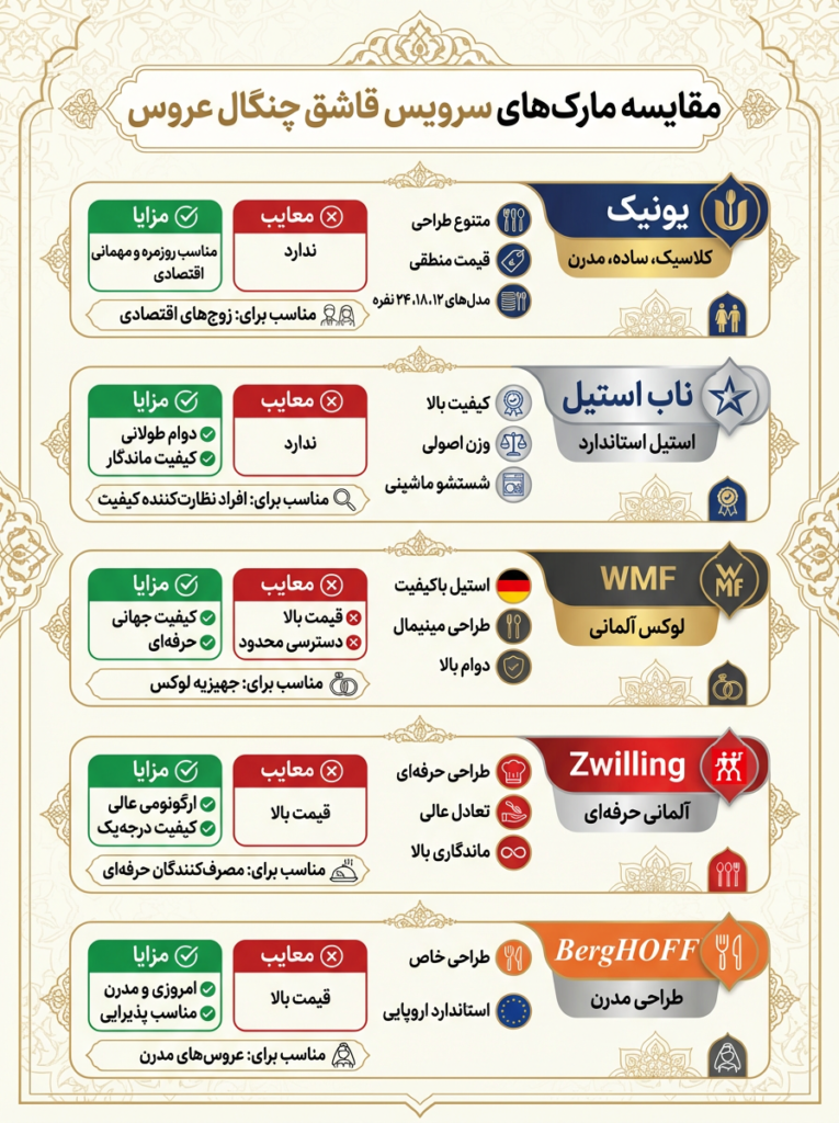| برند | سطح قیمت | کیفیت ساخت | مناسب جهیزیه | سبک طراحی |